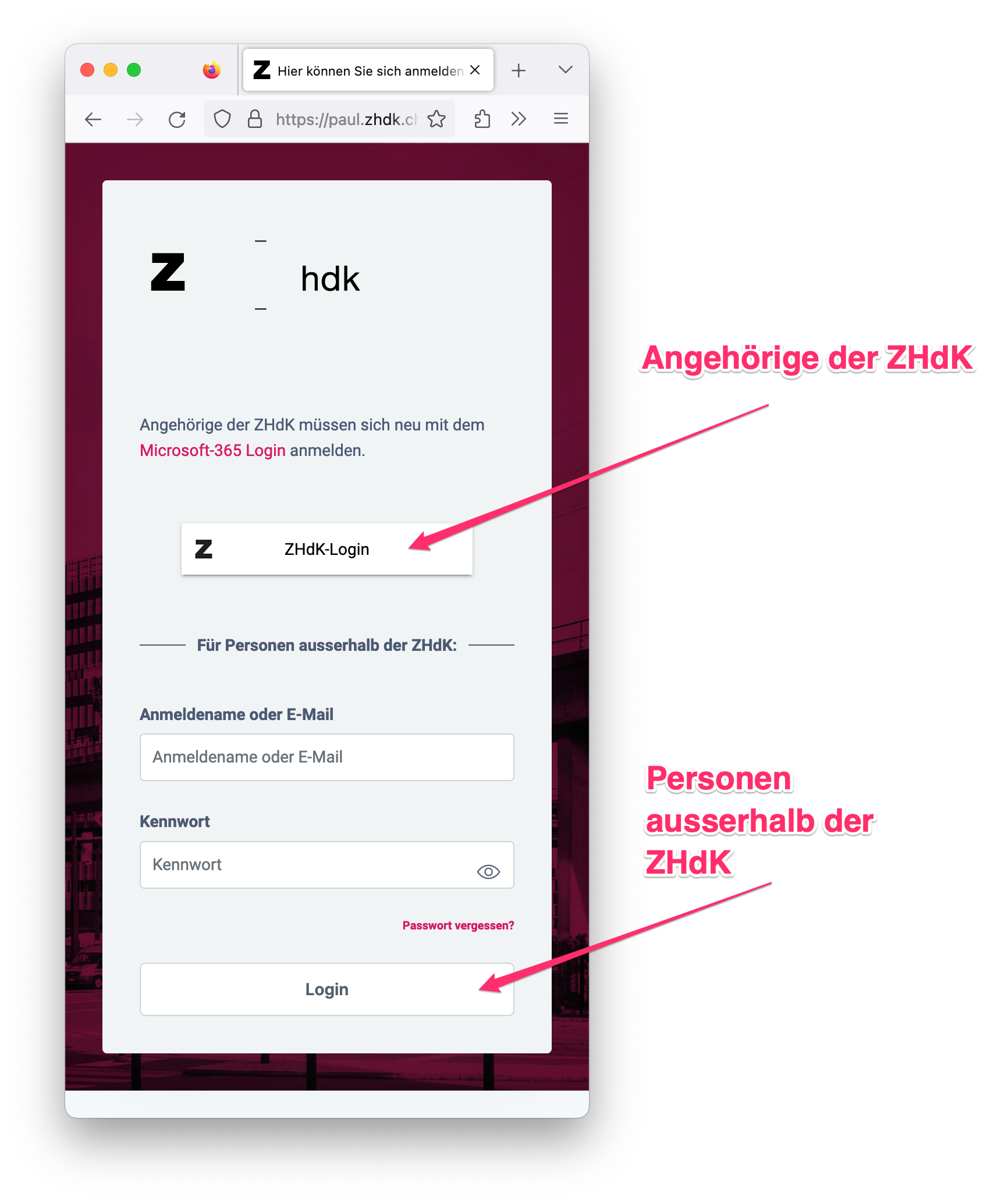 | Antwort: Angehörige der ZHdK müssen sich mit dem Microsoft-365-Login anmelden. Personen ausserhalb der ZHdK melden sich mit den persönlichen Anmeldedaten an. Falls du Anmeldename oder Passwort vergessen hast, nutze die Passwort vergessen-Funktion unter https://paul.zhdk.ch/login/forgot_password.php