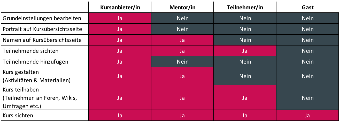 | Antwort: PAUL verfügt über die vier Rollen Kursanbieter/in, Mentor/in, Teilnehmer/in, Gast, die unterschiedliche Rechte besitzen: ![]() Kursanbieter/in