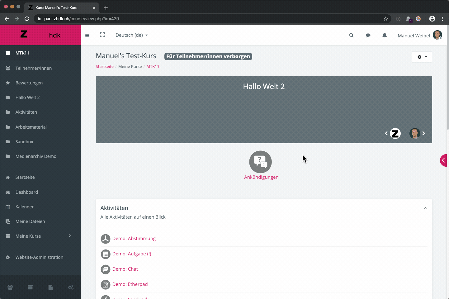 Frage: (Zuletzt bearbeitet: Montag, 27. Mai 2024, 14:08)Wie kann ich im Kurs mit den Teilnehmenden kommunizieren? | ||||