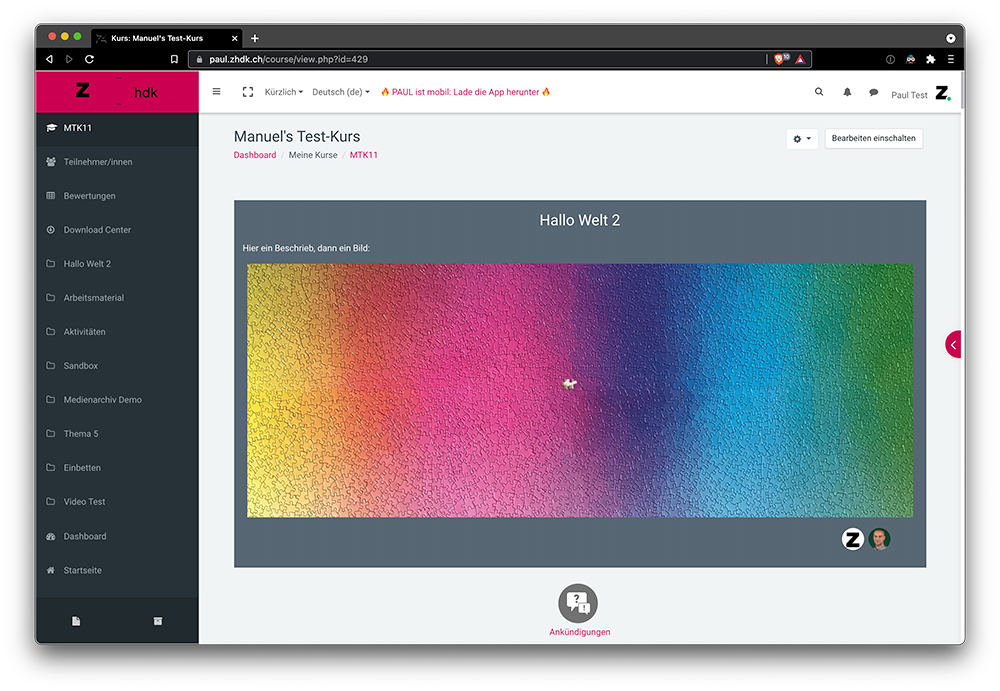 | Antwort: Es gibt eine Vielzahl von Materialien und Aktivitäten, die in PAUL integriert werden können. Die verlinkte Liste schafft eine Überblick – dabei sind die, aus unserer Sicht, spannendsten fünf Möglichkeiten rot markiert: https://paul.zhdk.ch/mod/page/view.php?id=1148